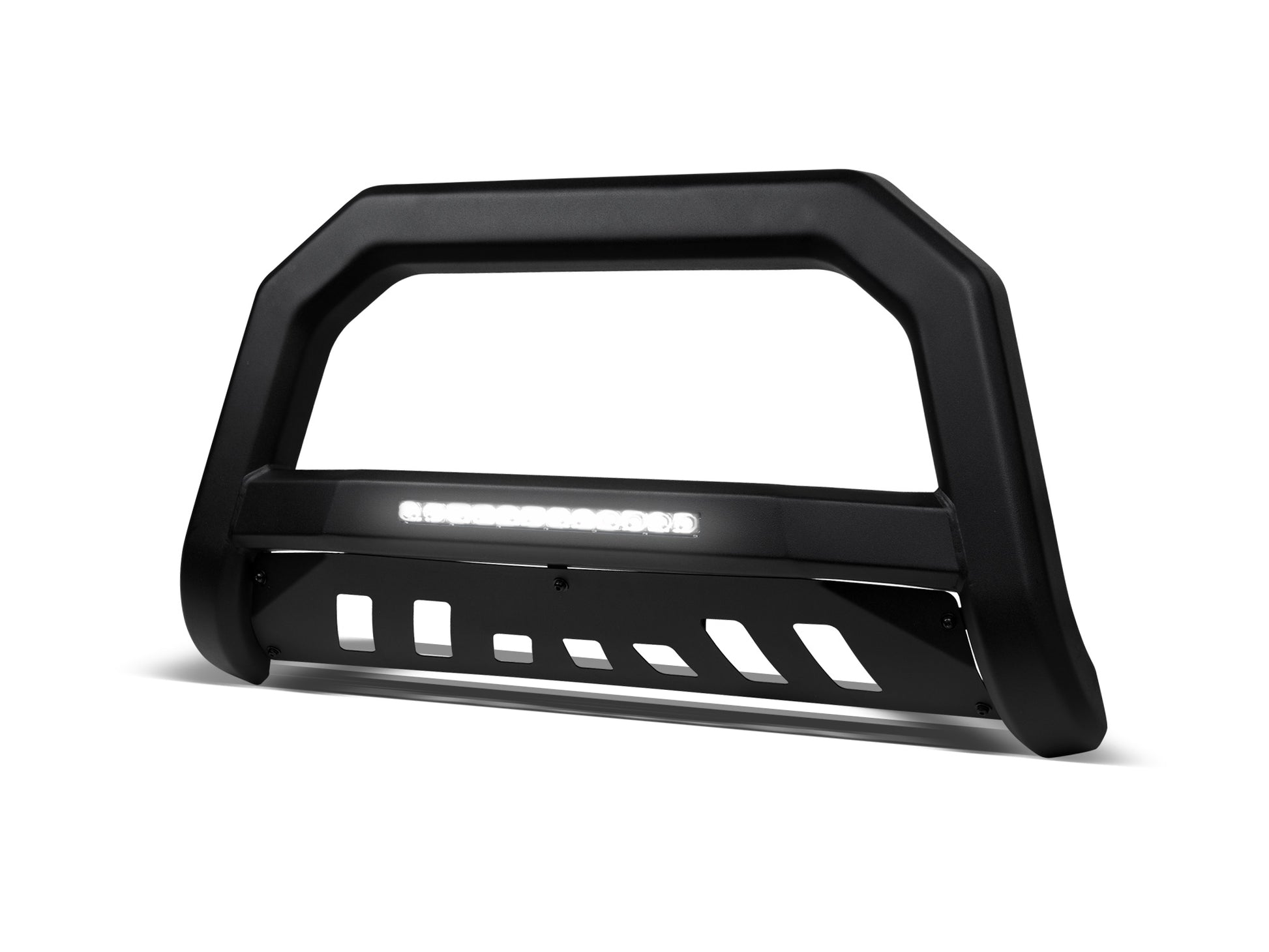 The all new Armordillo® AR-T Bull Bar is the front-end shield against minor collisions, branches, rocks, and wayward deer. Using the latest Forge Pressed technology our Multifacated Design Bull Bar will be strong enough for any road condition. In addition, the bull bar features an built in 12" LED light bar and additional auxiliary light mount holes, making it easy to add a set of auxiliary lights to increase illumination and visibility. The AR-T Bull Bar's three stage powder coat protects from rust and corrosion so you can enjoy the brand-new look of your product for many years to come.