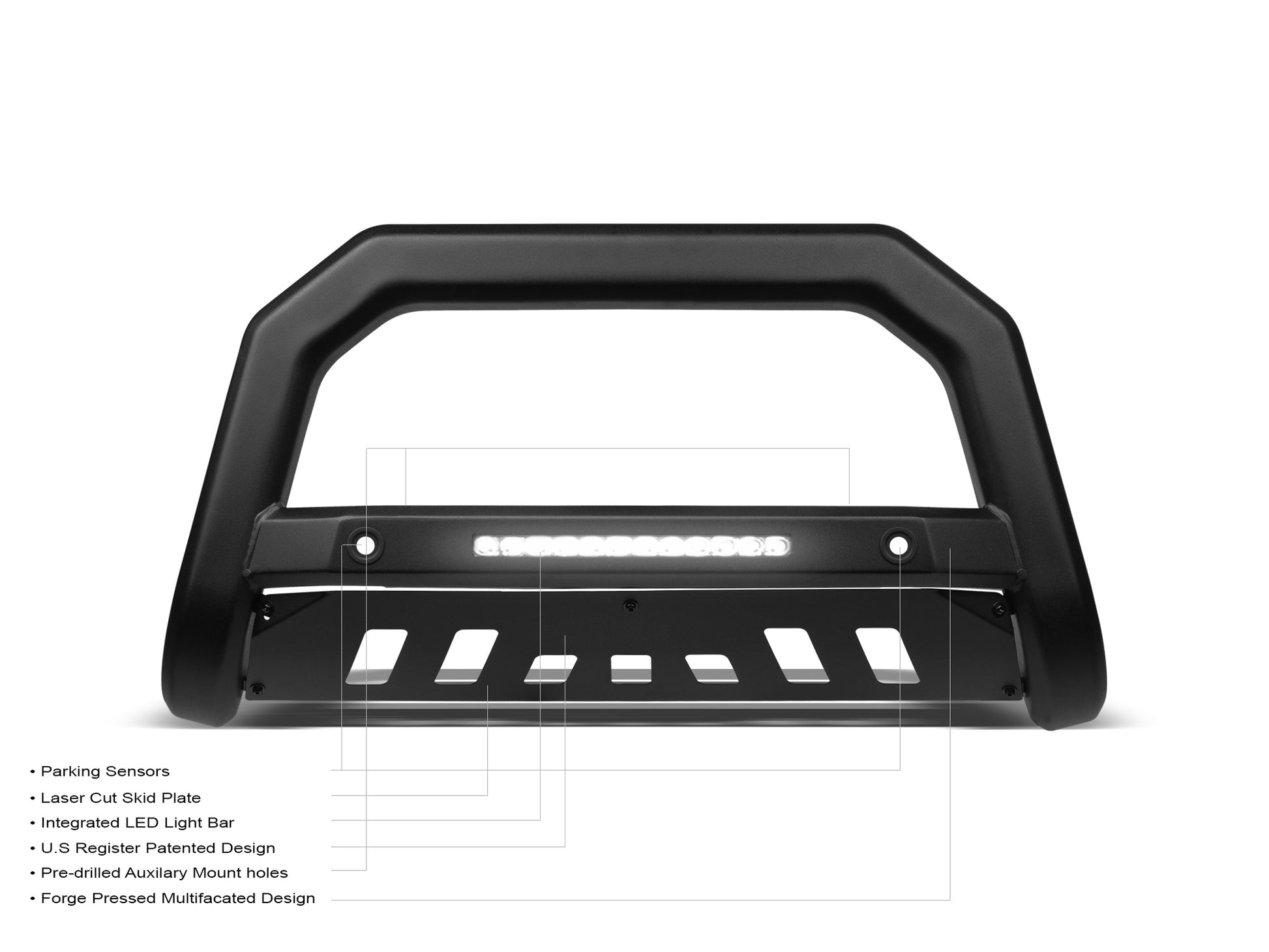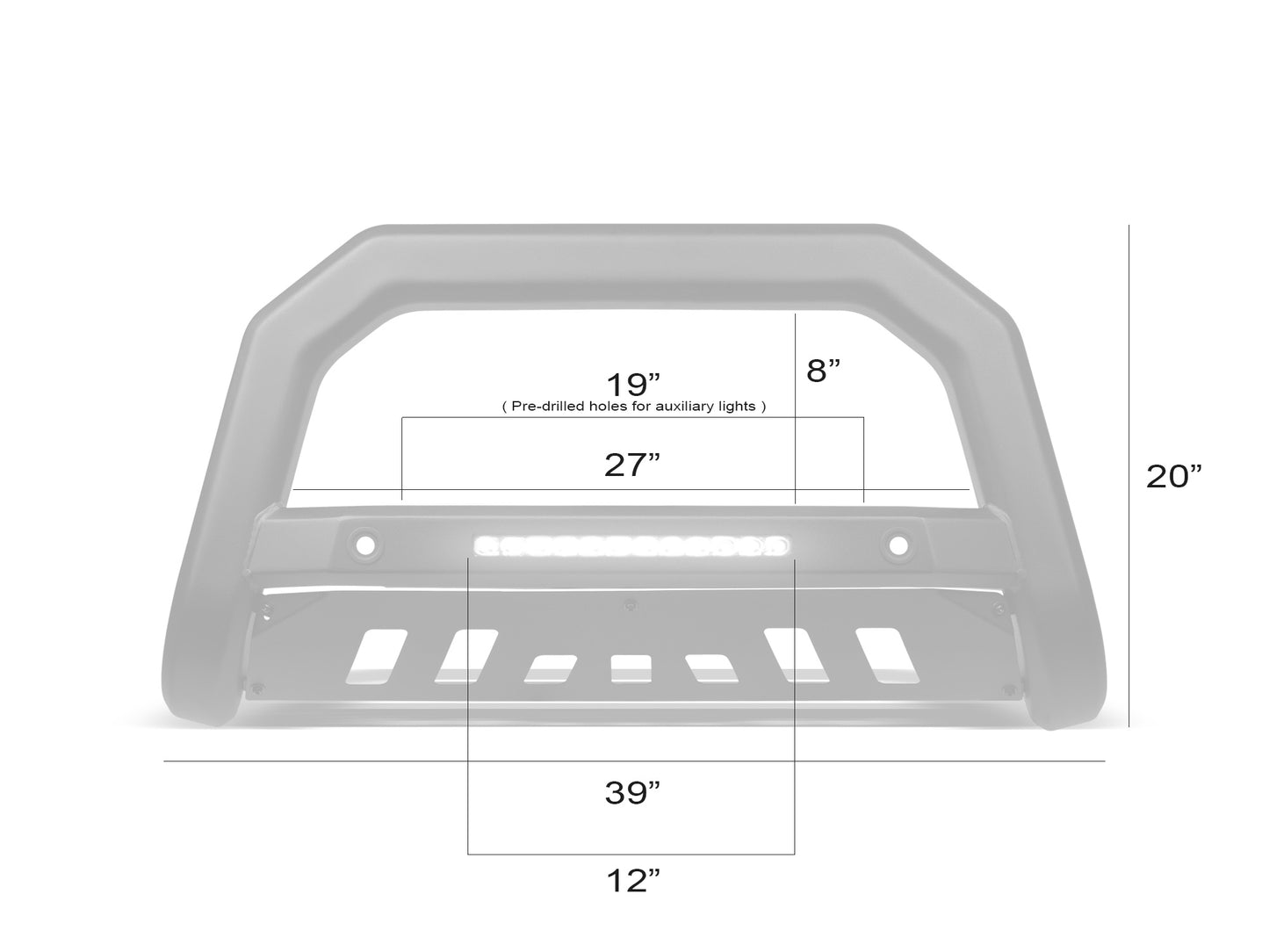 The all new Armordillo® AR-T Bull Bar is the front-end shield against minor collisions, branches, rocks, and wayward deer. Using the latest Forge Pressed technology our Multifacated Design Bull Bar will be strong enough for any road condition. In addition, the bull bar features an built in 12" LED light bar and additional auxiliary light mount holes, making it easy to add a set of auxiliary lights to increase illumination and visibility. The AR-T Bull Bar's three stage powder coat protects from rust and corrosion so you can enjoy the brand-new look of your product for many years to come.